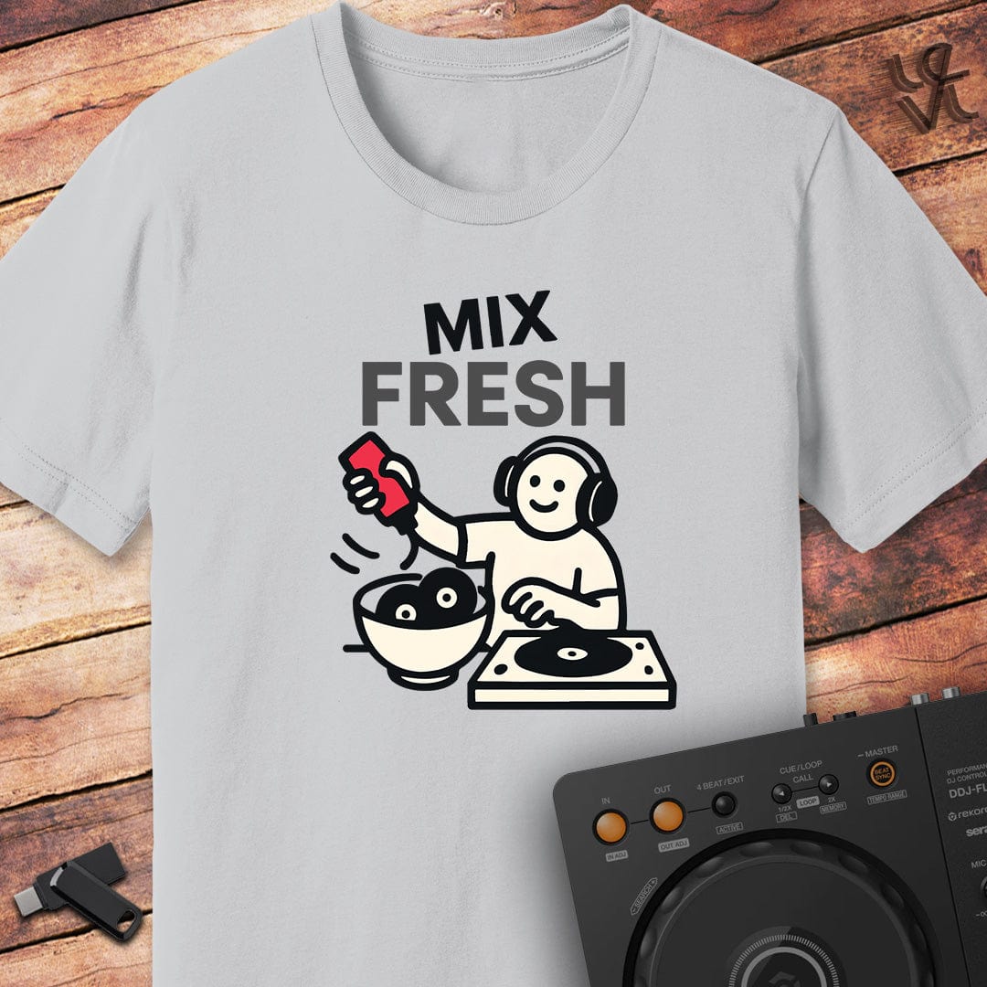 For those who know that the perfect track is just like the perfect recipe, the "Mix Fresh" tee is a fun spin on your love for mixing. Featuring a DJ mixing a bowl of records, this shirt celebrates the creativity and flair that goes into every great set. Whether you're tossing vinyl on the decks or just blending genres, this tee is your perfect match for those who know that a fresh mix always hits the spot.
