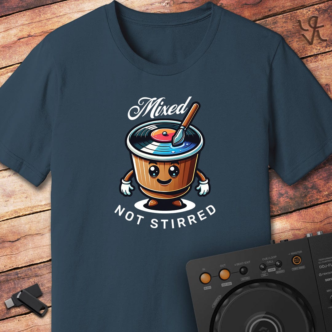 Spin with sophistication in this cheeky twist on a classic with our Mixed, Not Stirred tee is where coffee culture meets club culture. Featuring a slick graphic of a steaming cup filled not with liquid but a vinyl record, and nodding to the iconic James Bond catchphrase, this shirt is a must-have for DJs, producers, and music lovers who know their mix is always shaken on the decks—not in a martini glass.